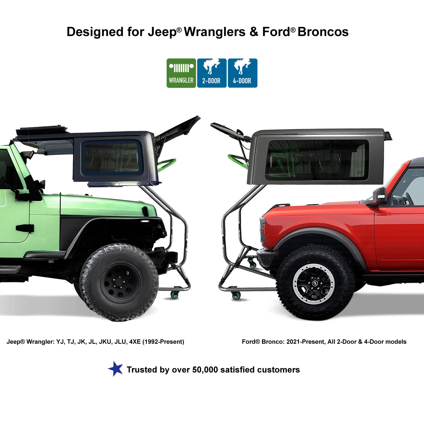 The TOPLIFT PRO™ v2.0 takes your Jeep Wrangler or Ford Bronco experience to the next level with a revolutionary design that combines ease of use, durability, and space-saving efficiency. Trusted by over 50,000 satisfied customers, the patented TOPLIFT PRO™ is the industry’s most reliable and trusted hardtop hoist and storage solution, specifically engineered for Jeep® and Ford Bronco enthusiasts. Whether you’re a seasoned off-roader or a weekend adventurer, this tool is built to make removing and storing your hardtop effortless.